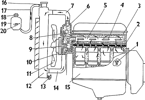 11 - ventilátor 12 - chladič 13 - výpustný kohout 14 - přívodní potrubí 15 - blok válců 16 - uzávěr chladiče 17 - hadice 18 - uzávěr nádržky 19 - vyrovnávací nádržka 20 - značka "MIN" |