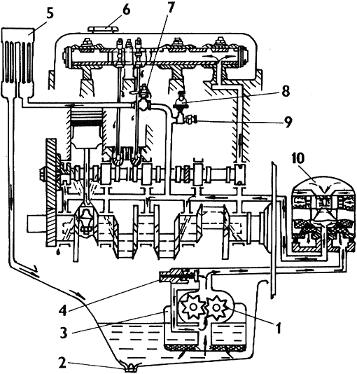 6 - uzávěr plnicího hrdla 7 - přepínací kohout chladiče 8 - snímač tlaku oleje 9 - snímač kritického tlaku oleje 10 - čistič oleje |