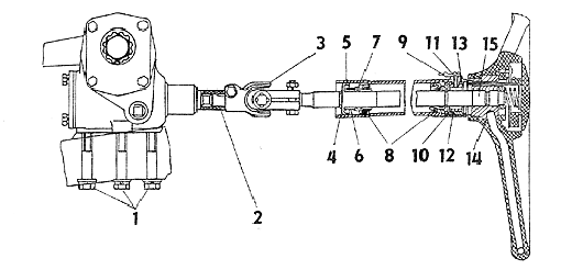 8 - ložisko 9 - kabel houkačky 10 - kontaktní deska 11 - šroub 12,13 - izolační podložka 14 - volant 15 - hřídel volantu |