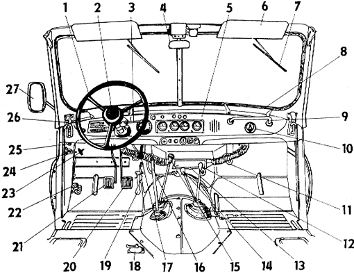 1 - volant 2 - tlačítko houkačky 3 - přepínač směrových světel 4 - zpětné zrcátko 5 - přístrojová deska 6 - clona proti slunci 7 - raménko stírače 8 - hadice pro ohřev předního skla 9 - madlo 10 - svítilna 11 - odpojovač akumulátoru 12 - řadicí páka pohonu přední nápravy 13 - víko vytápění 14 - řadicí páka redukce |